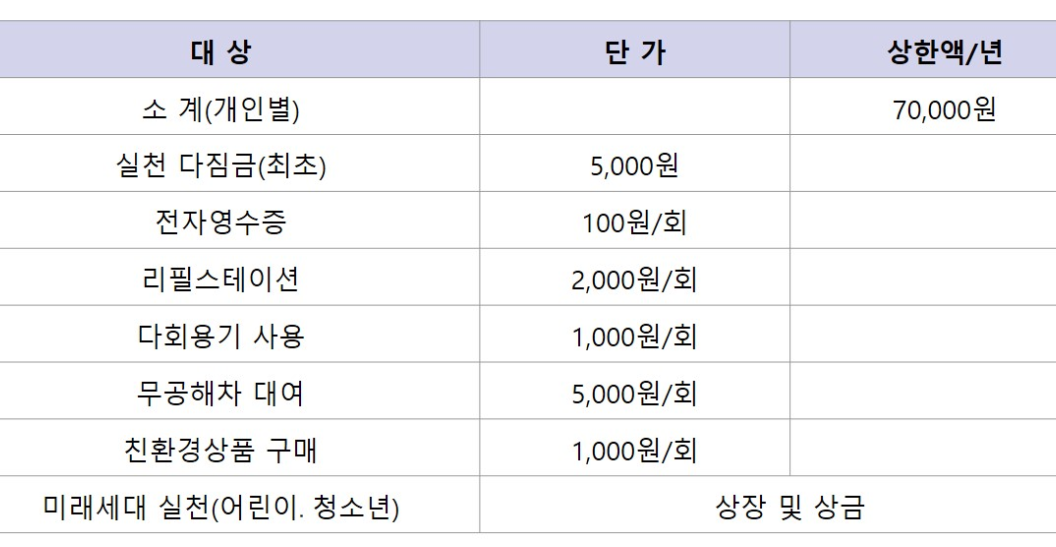 국민의 탄소중립생활 확산을 위하여 민간기업의 친환경활동을 이용 시 이용실적에 따라 현금이나 포인트를 지급하는 제도입니다.